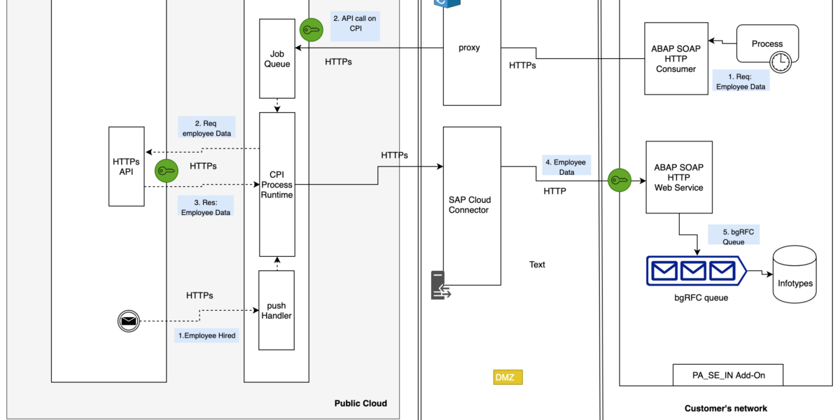 Fun fact: Compound Employee API is the only SOAP API in the SuccessFactors API arsenal. The rest of them are well, ReSTful in nature. - The response from these APIs are transformed, only a wee bit infact*, and is then relay across to SAP HCM via an on premise agent called the SAP Cloud Connector.* The response from SF is almost entirely sent across to SAP. Only a few header parameters are added for audit and security reasons.SAP Cloud Connector is a reverse proxy tunnel. Sitting in the DMZ of the customer, it allows secure connections to the SAP HCM system without having to open up any ports or additions to the allow list on the firewall.