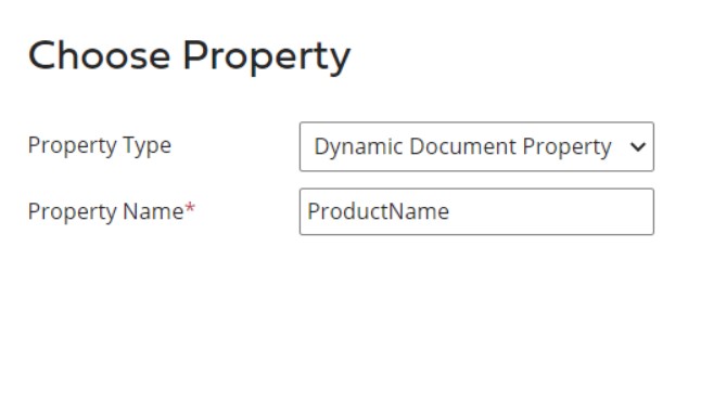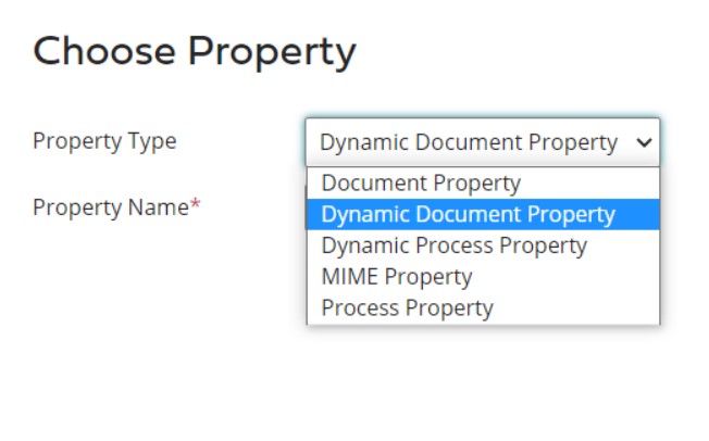Under Properties to Set, click on the ‘Add Property’ (+) icon. In the popup, select Property Type as ‘Dynamic Document Property’.