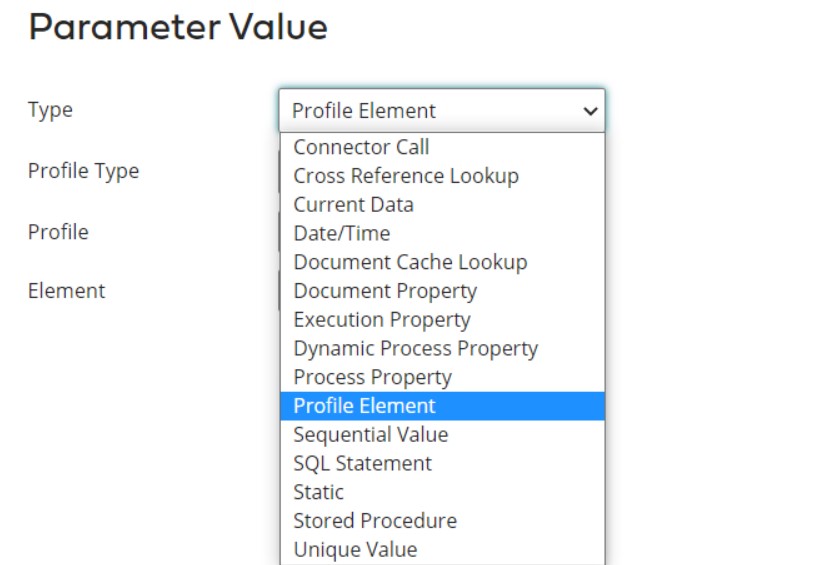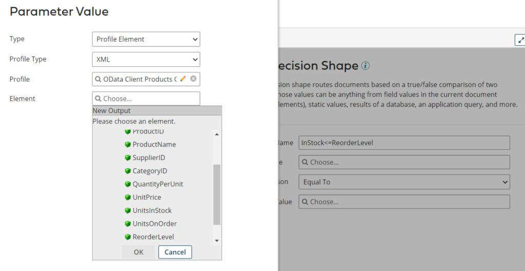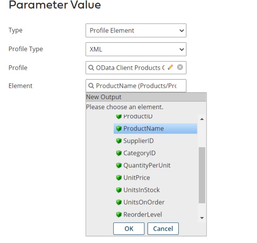 Select Type as Profile Element, Profile Type as XML, and then select the profile that was created during the OData Query operation. Select Product Name in the input control labelled as Element. Click on Ok.