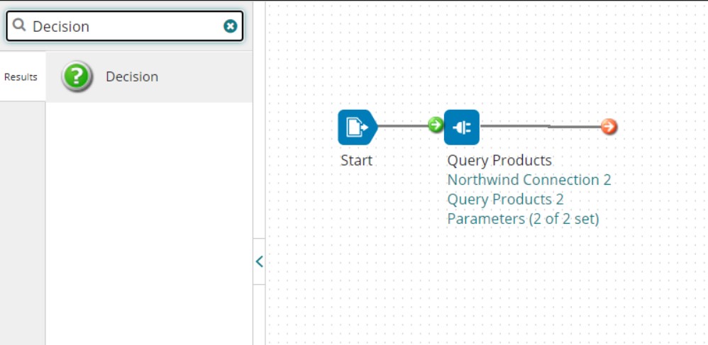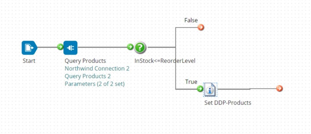 Now we are going to select products which need to be reordered so that only these products are processed further. Details of the other products can be safely ignored. To decide if a product is to be reordered, we’re going to check if the Units in stock are less than or equal to the Reorder Threshold for that product. For this purpose, we are going to use a decision shape.