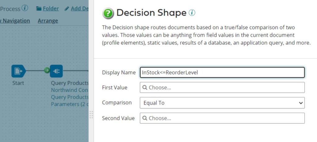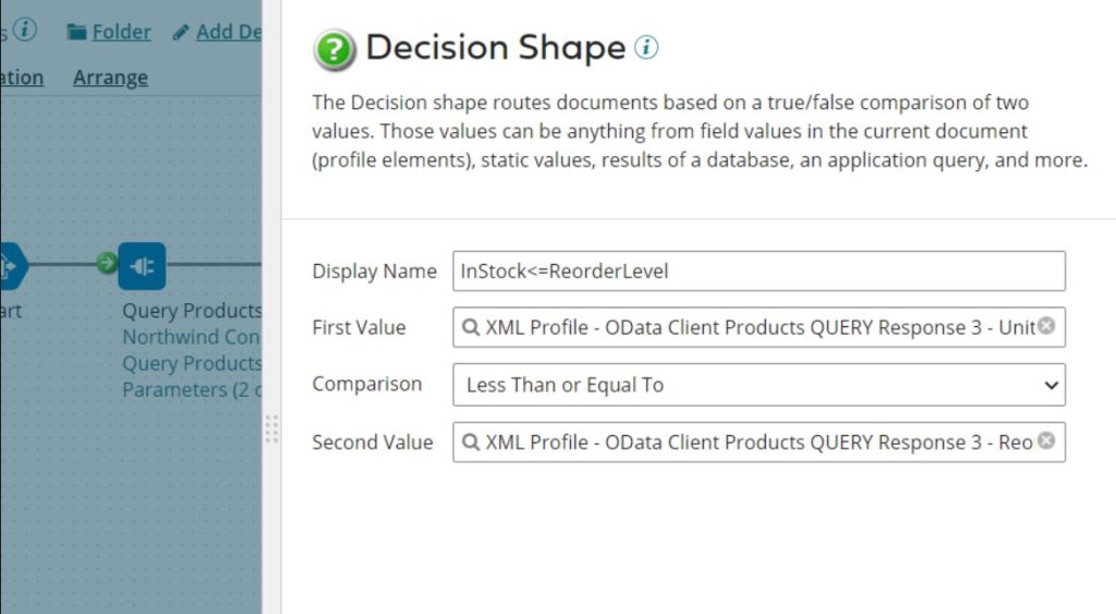 In our scenario, we need to evaluate if the Units in stock are less than or equal to the Reorder Threshold for a particular product. Since both of these are profile fields and because there can only only be two outcomes, true or false, we are going to use a decision shape instead of a Route shape.
