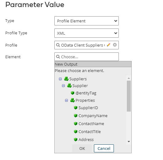 In the Variables field of Message shape, we are going to add these field data from Profile Elements and Dynamic Document Properties. Click on the + icon adjacent to this field. To add Profile elements, select the Parameter Type as Profile Element and configure it as shown below.