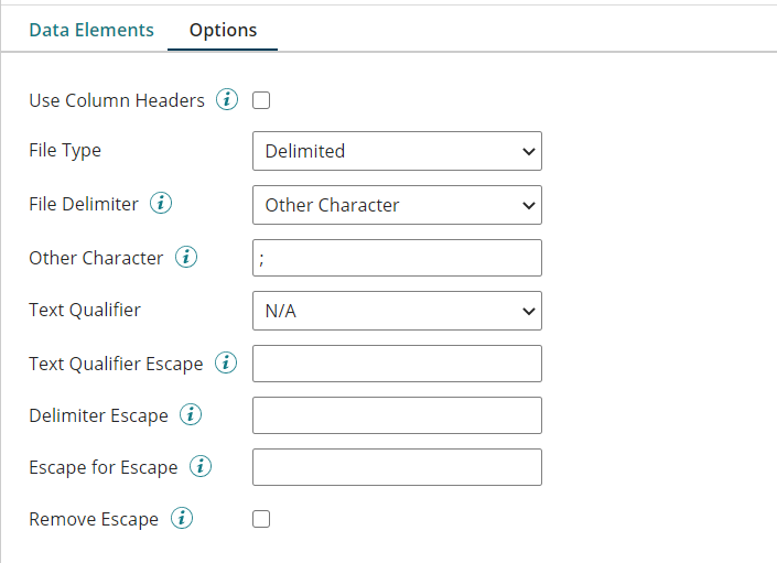 Click on the Options tab to specify the delimiter for this profile. We are going to use a semicolon as a delimiter. This can be specified as: