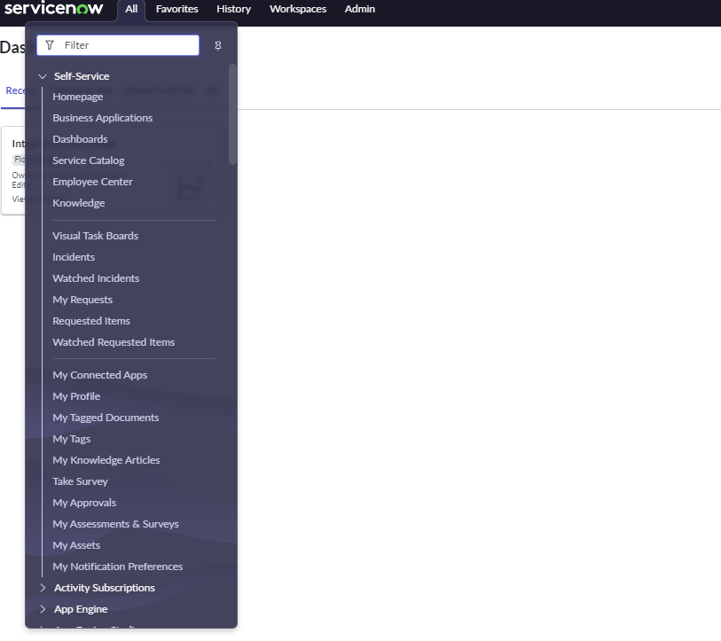 The different tools and applications in ServiceNow are segregated by System Applications which can be accessed using the Application Navigator. To look for specific System Applications, the All tab on the Banner can be used. The filter in this tab, narrows down the applications that you may be looking for under a particular module. This helps you quickly find applications and modules and also launch them in separate tabs for quick access.