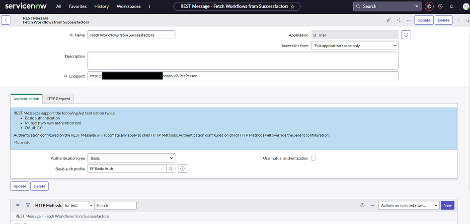 In this form, you can select an API credential that is stored in the Connections and Credentials application. Once you’re all set up with your REST message, you can try it out by adding a new HTTP method and running the TEST option on it.