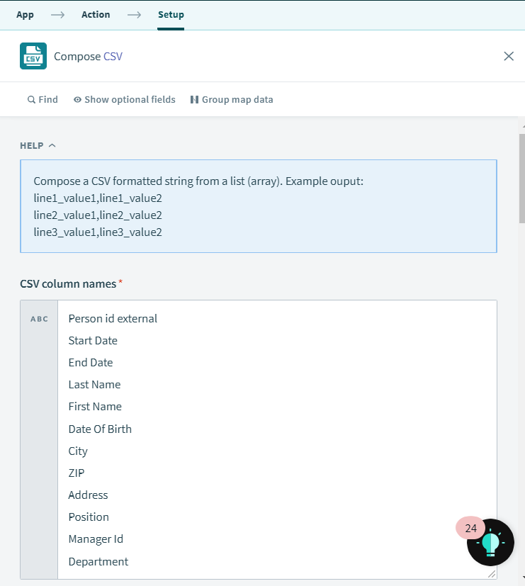 After querying all the necessary objects, we will be building a CSV file where we can collate and organize all the fields obtained thus far as distinct columns in a comma-separated format. The action provided by Workato to establish this is called Compose CSV. Here, we can also specify a different delimiter such as a semicolon. We need to enter the column names in our CSV in the respective text box as shown in the image below.
