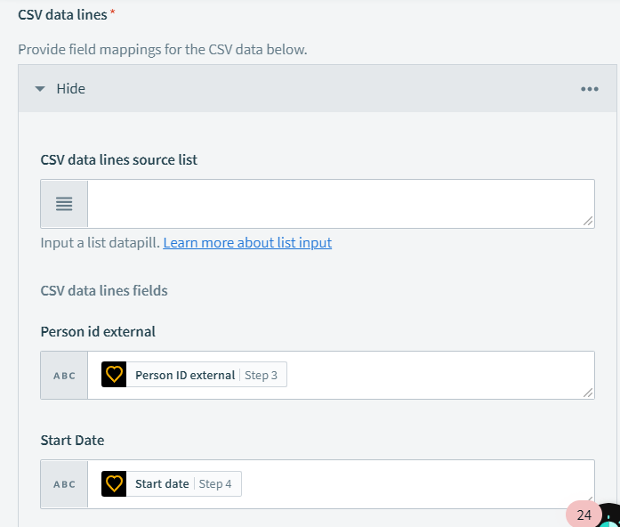We then need to map our columns to the fields that we have queried. This is done by obtaining these fields in the form of data pills from previous steps of the recipe and dragging and dropping the pills respectively at the newly formed fields created in the Setup tab. These fields are created dynamically just as we enter them on in our CSV Column Names text area.