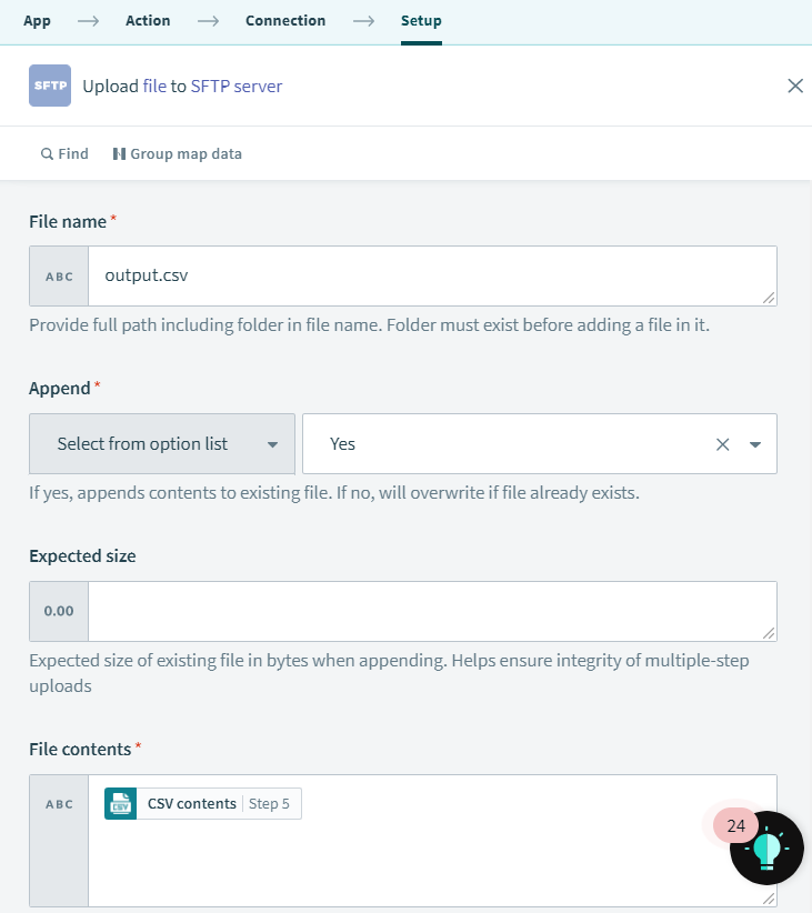 When sending over data to a destination SFTP server, we can make use of the Upload file to SFTP server action where we need to configure the connection to the SFTP server first and make sure that it is valid and active. Once that is done, we must specify a couple more fields as shown below. Here, we also add in our CSV file that we obtain from the previous step so that it can be mapped to our SFTP file Action.