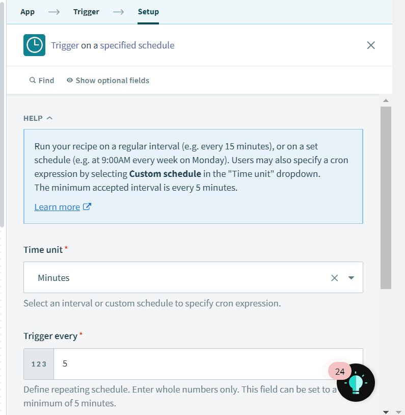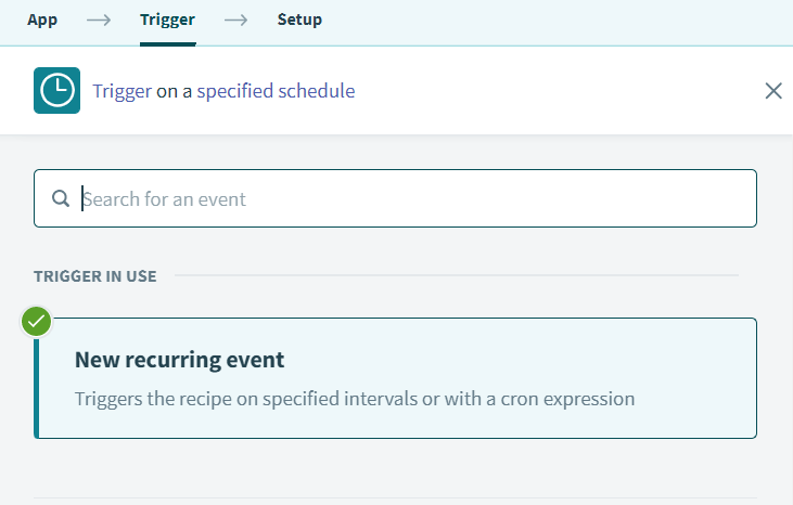 When configuring our first step of the recipe – building our trigger, we need to select an app that will be used for our trigger. Workato offers a list of applications that are available to execute a trigger from. For our example, we do not have any dependency on any third party platform so we just make use of a Scheduler app which is an inbuilt application in Workato.