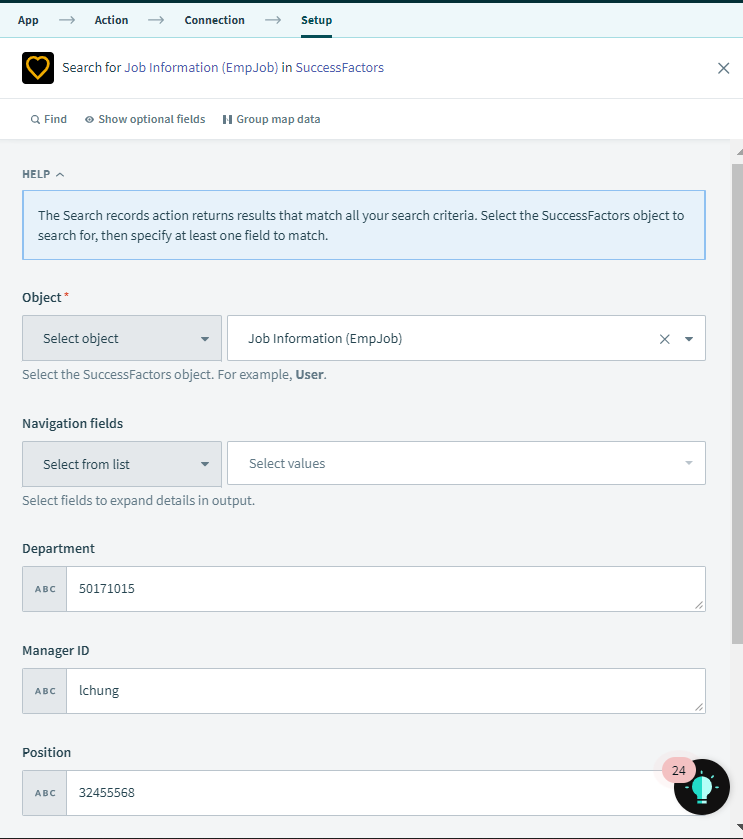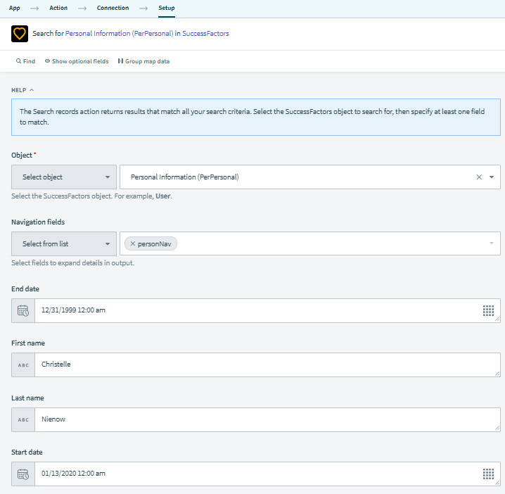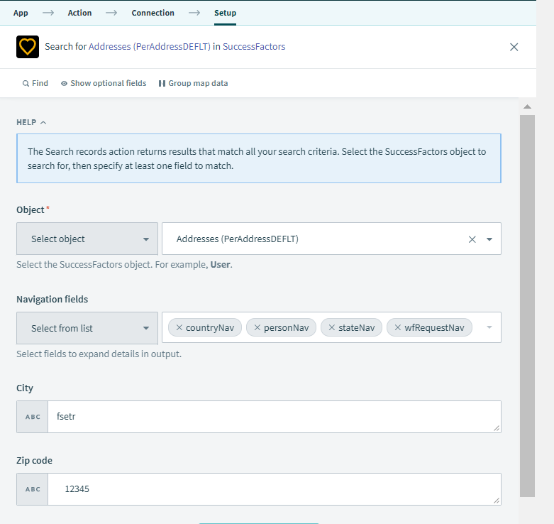 Moving on to our next step, after we have triggered the recipe, we will now be configuring a list of Actions. The first action for us will be querying EmpJob from SuccessFactors. For this we select the Search a record action under the SuccessFactors App. For configuring this step further, we select our search object in the Setup tab and filter out the required fields.