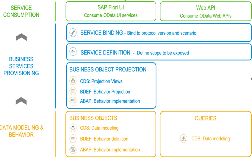 This model uses CDS for defining data models, ABAP based application services for custom logic and interfaces based on SAPUI5. SAP Fiori application consumes the logic defined by data model and behavior, and expresses, and exposes as business services. Without further ado, let’s have a look at the main layers of ABAP RAP: