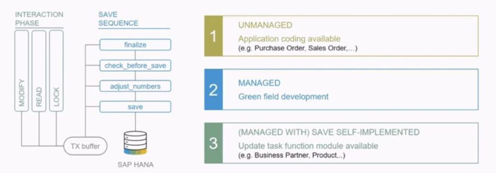 - Managed with save scenario: In this scenario, the tables are not updated directly with the data. Instead BAPIs, or update function modules can be called to save the data. Currently it is available for SAP internal purpose only.